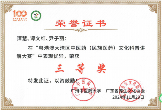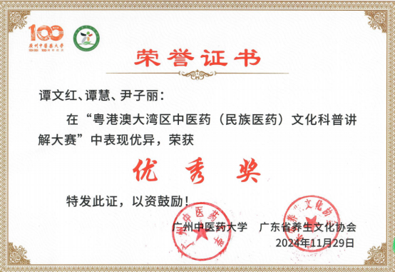谭慧老师科普作品《傣药肾茶》在粤港澳大湾区中医药(民族医药)文化科普讲解员大赛中荣获三等奖。