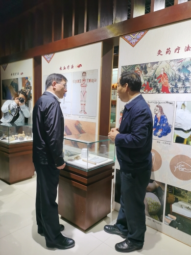 张超教授从云南民族医药丰富多彩的历史文化背景、云南独特的特色诊疗技术、云南民族药材标准现状及近20年来云南民族医药在科研、教育、产业方面所取得的成绩等方面做了详尽介绍。王予波副书记饶有兴趣的边参观边提问,通过参观肯定了我校民族医药团队近几十年取得的成绩,用“如数家珍”四个字高度赞赏了张超教授对博物馆和民族医药事业的热爱情怀,肯定了我校博物馆在中医药民族医药文化传播传承中的重要作用。